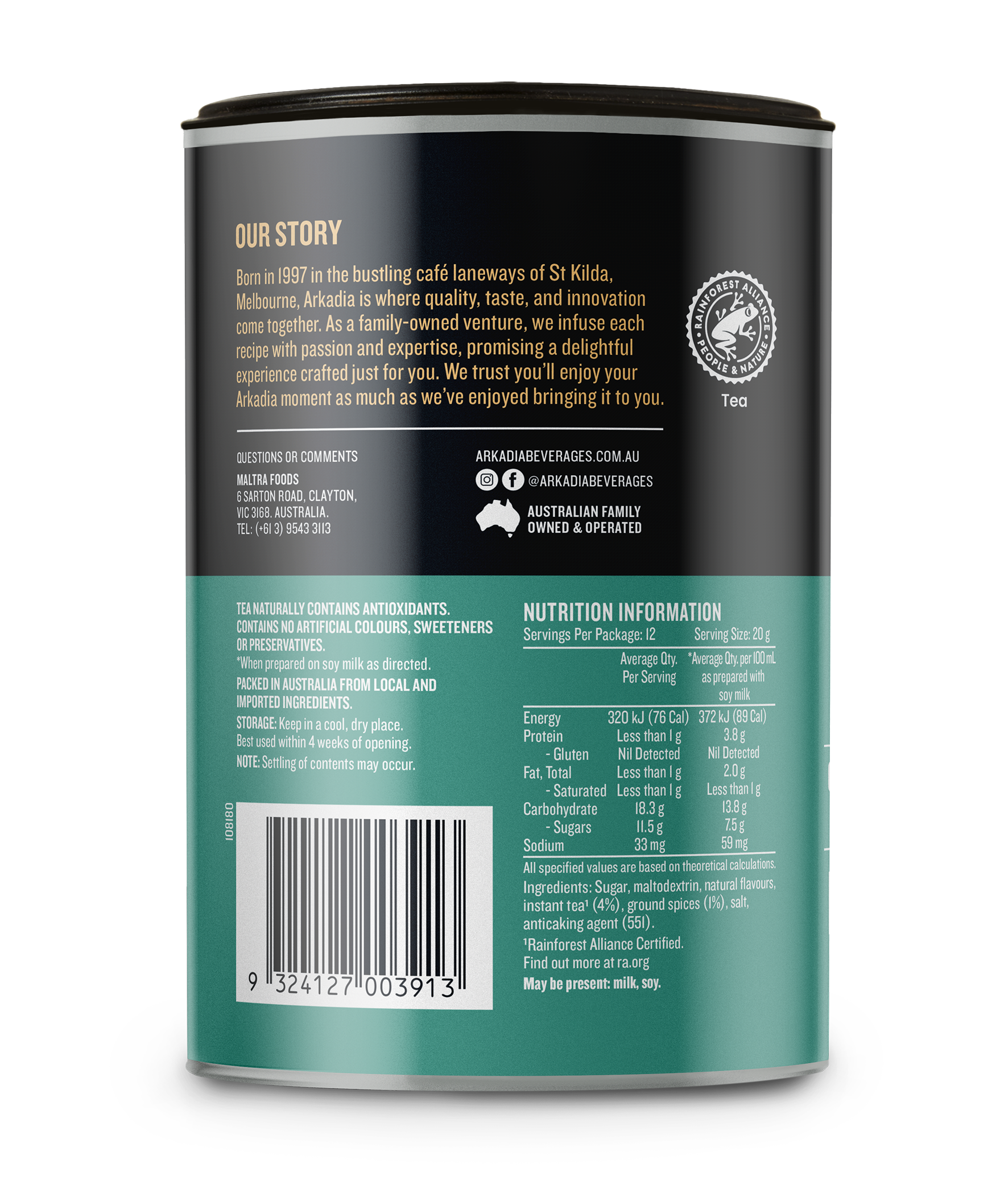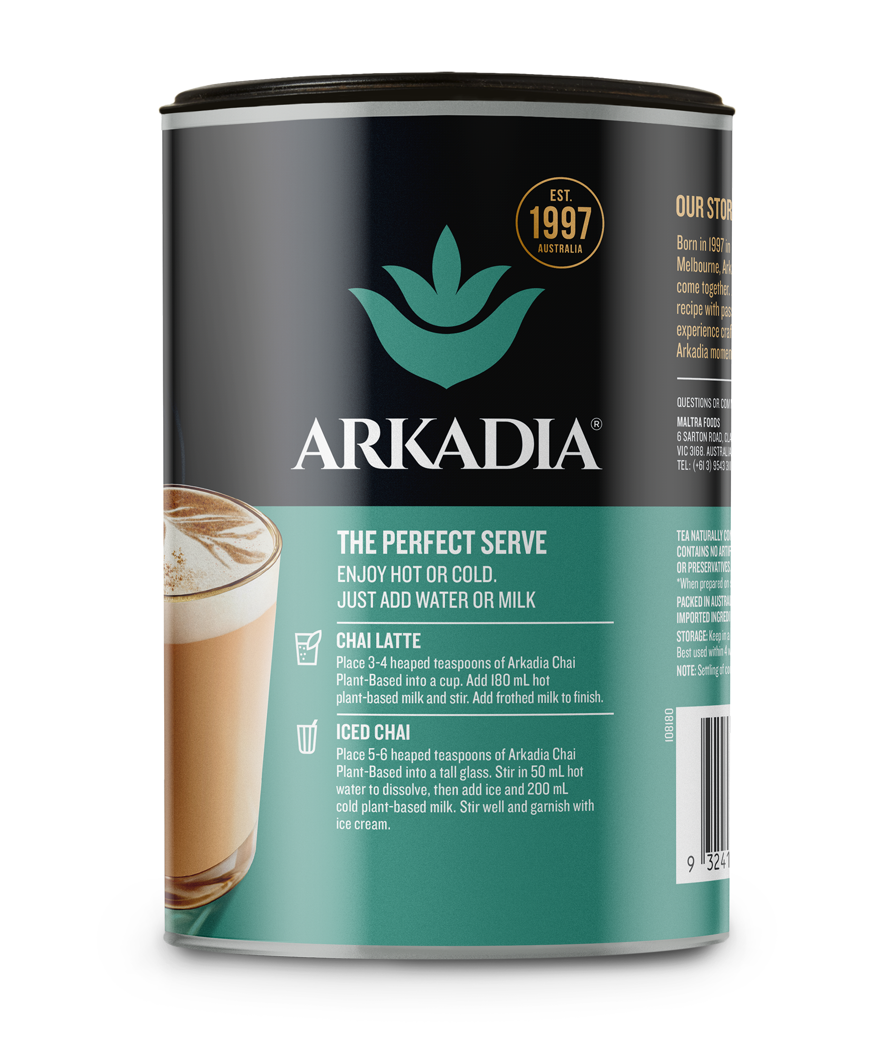 Dairy Free, Gluten Free, Plant-Based, and Halal Certified, Arkadia Chai Tea Vegan is crafted for those seeking a plant-based chai experience.